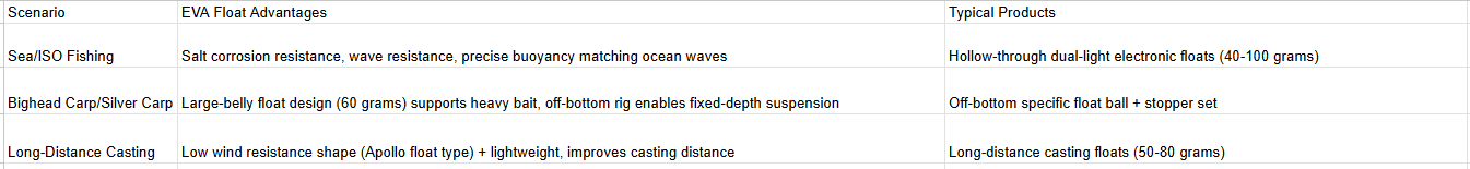 EVA: lla on pieni tiheys (tyypillisesti alle 0,93 g/cm³), mikä tarjoaa voimakkaamman kelluvuuden kuin puun tai muovin, ja siinä on laaja valikoima käytettävissä olevia kelluvuusarvoja (10-100 grammaa). Sen suljetun solujen rakenne estää veden imeytymistä säilyttäen vakaan kelluvuuden jopa pitkittyneen upottamisen jälkeen välttäen perinteisten materiaalien veden imeytymisen aiheuttamaa "ajautumisongelmaa".